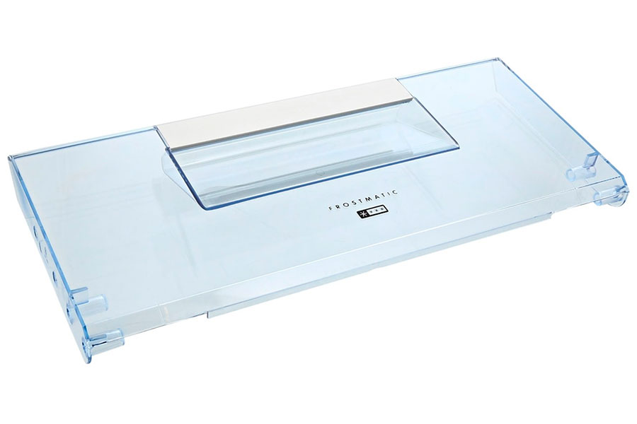 Vippelåge øverst og 2. øverst “Frostmatic”, transparent blå nuance med sølvfarvet håndtag.